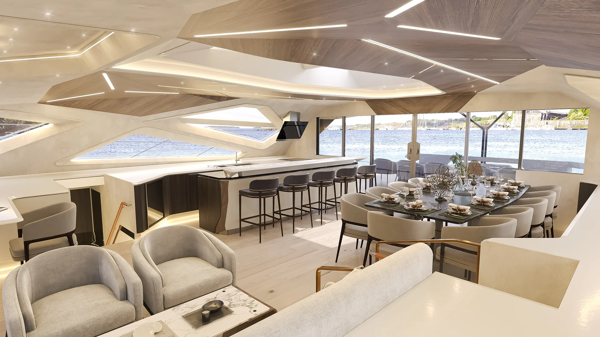 Inside, the open plan main salon brings together dining, lounge, and galley in a single smooth space, framed by large windows and skylights that fill the interior with natural light. Materials and tones create a calm coastal feel with soft beige fabrics, warm wood accents, and gentle ocean blue details.