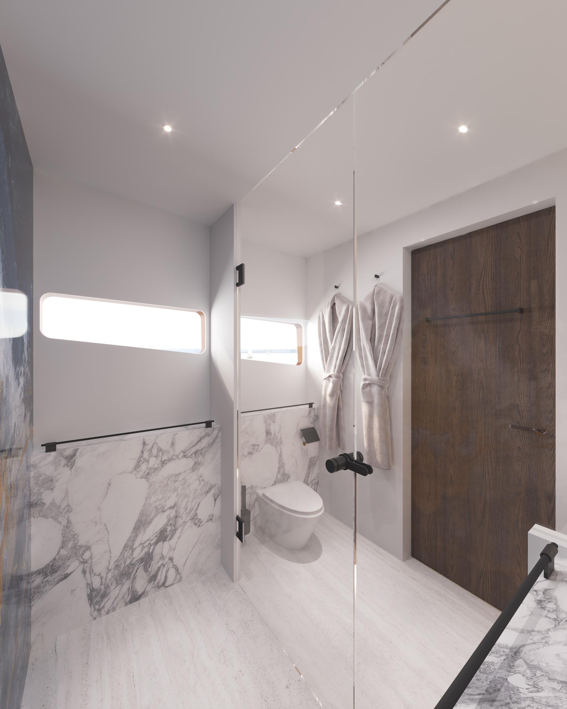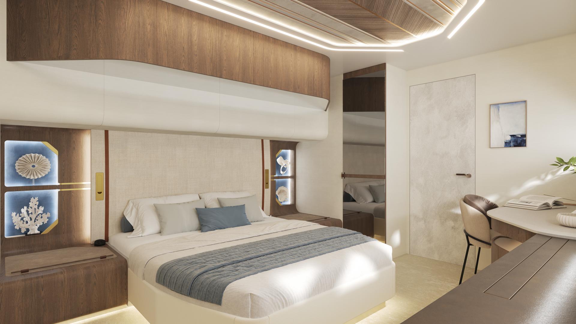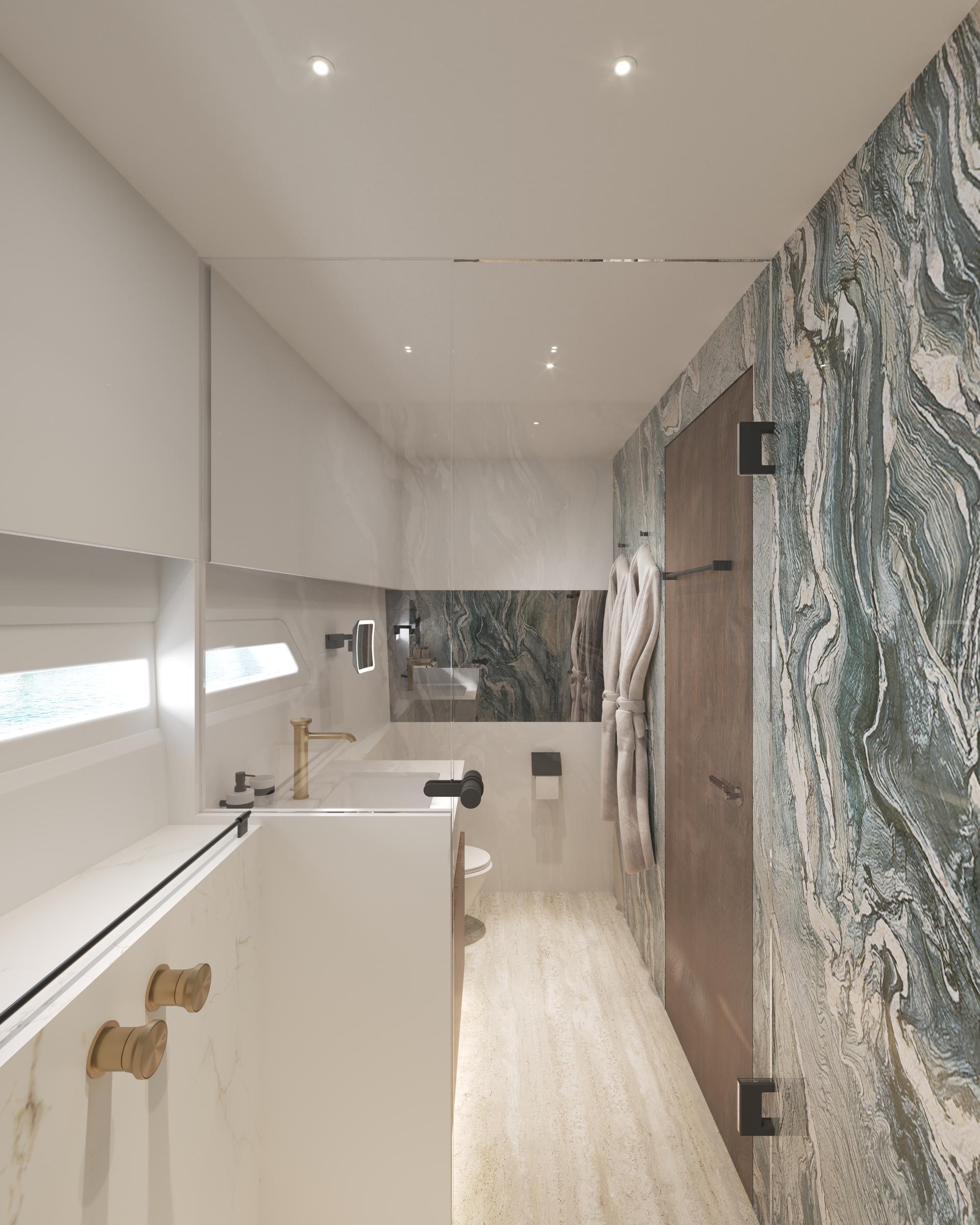 A king size bed, built in desk, and generous storage create a comfortable retreat for extended voyages, while subtle textures, refined woodwork, and soft ambient lighting balance luxury and tranquility. A full height en suite shower room completes the suite, delivering the privacy, comfort, and sophistication expected of a luxury power catamaran.