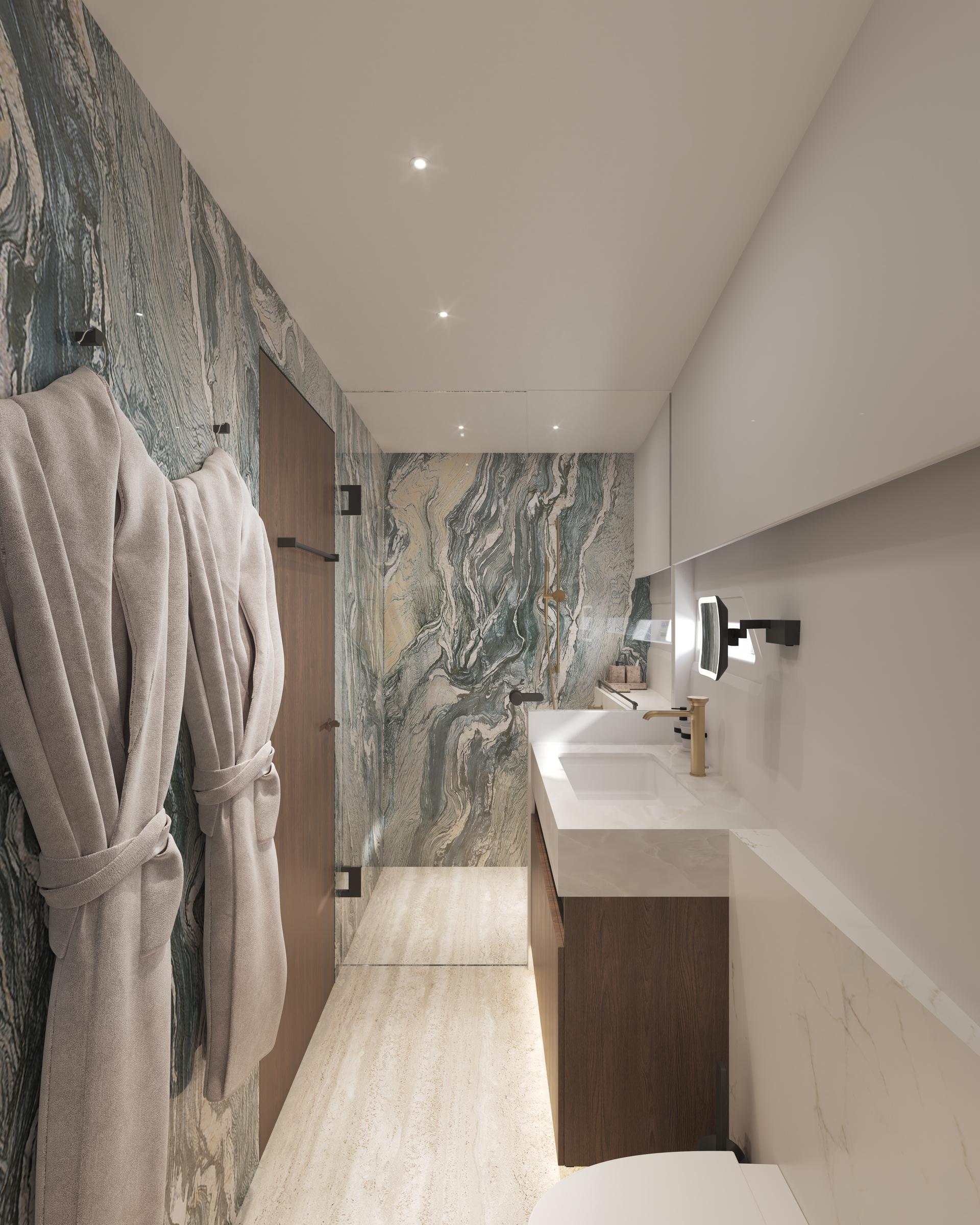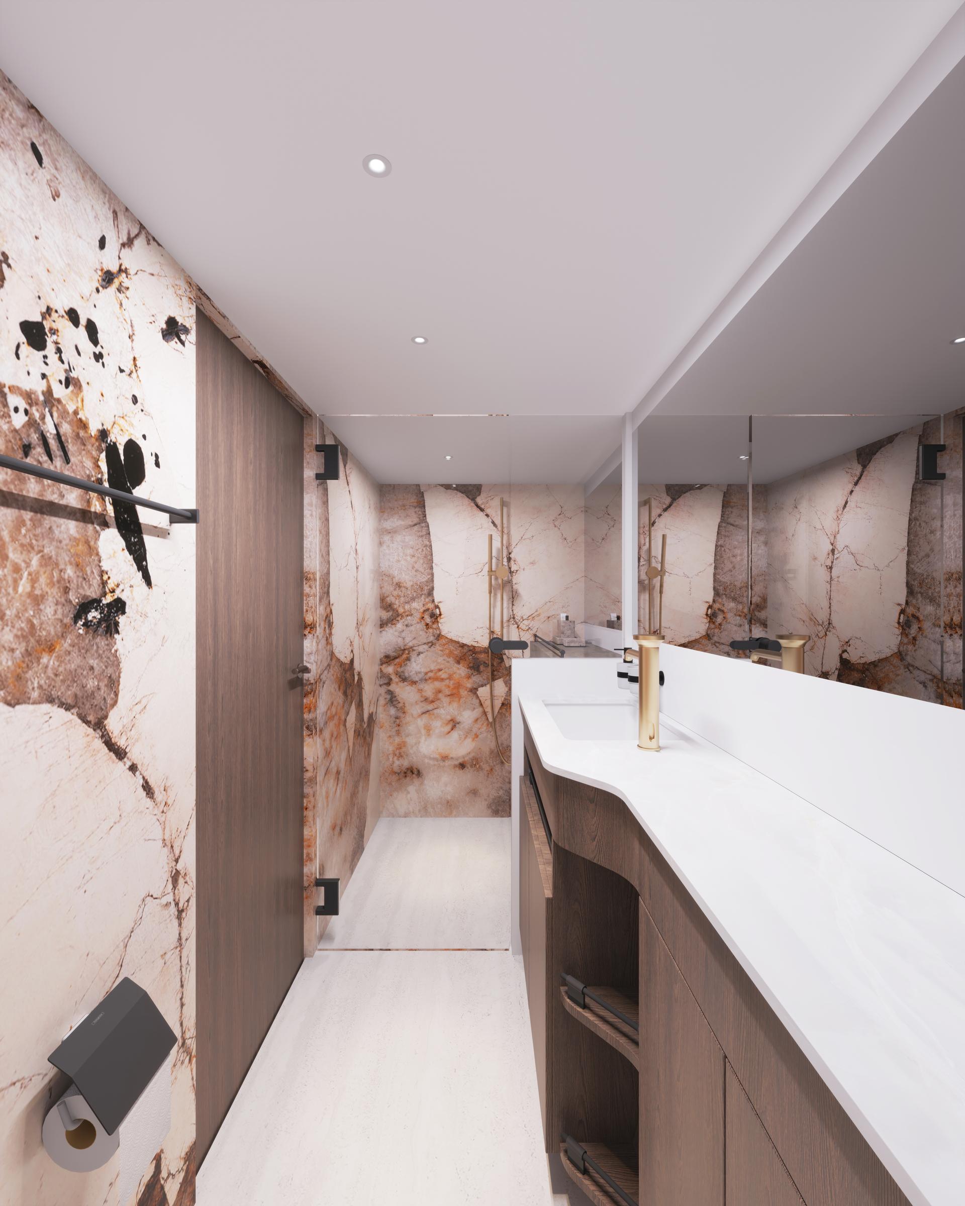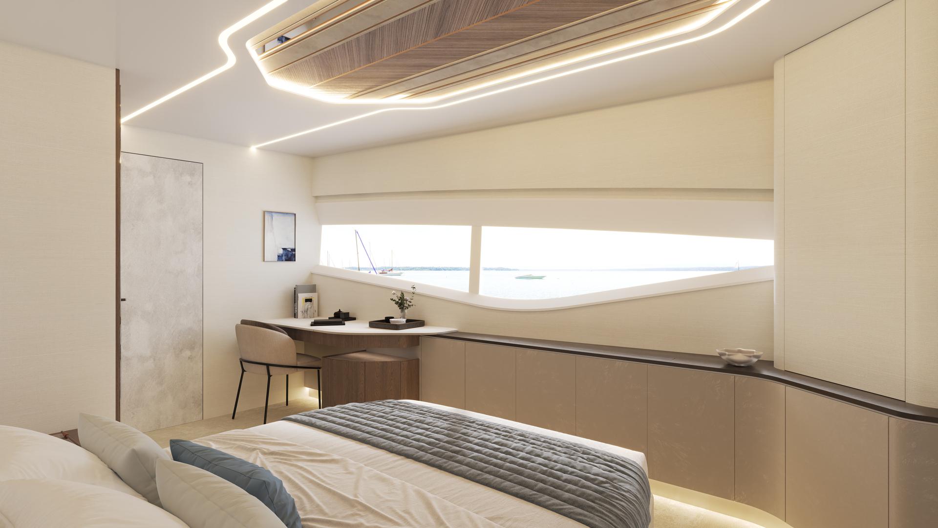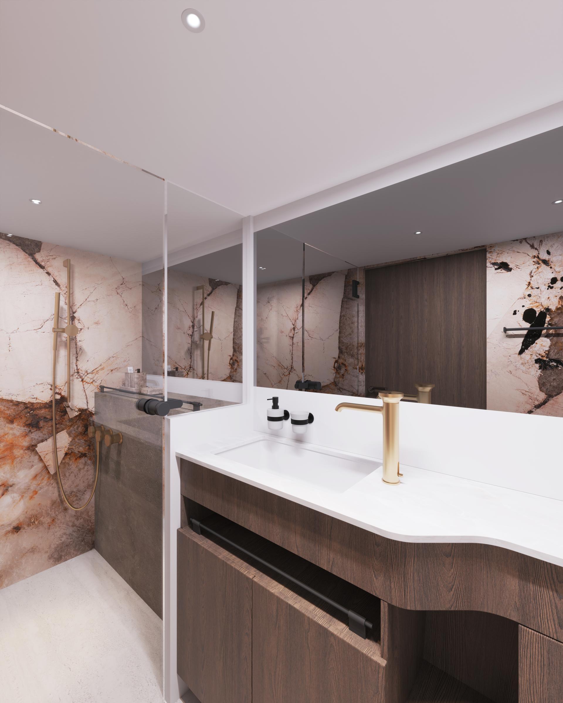 A king size bed, built in desk, and generous storage create a comfortable retreat for extended voyages, while subtle textures, refined woodwork, and soft ambient lighting balance luxury and tranquility. A full height en suite shower room completes the suite, delivering the privacy, comfort, and sophistication expected of a luxury power catamaran.