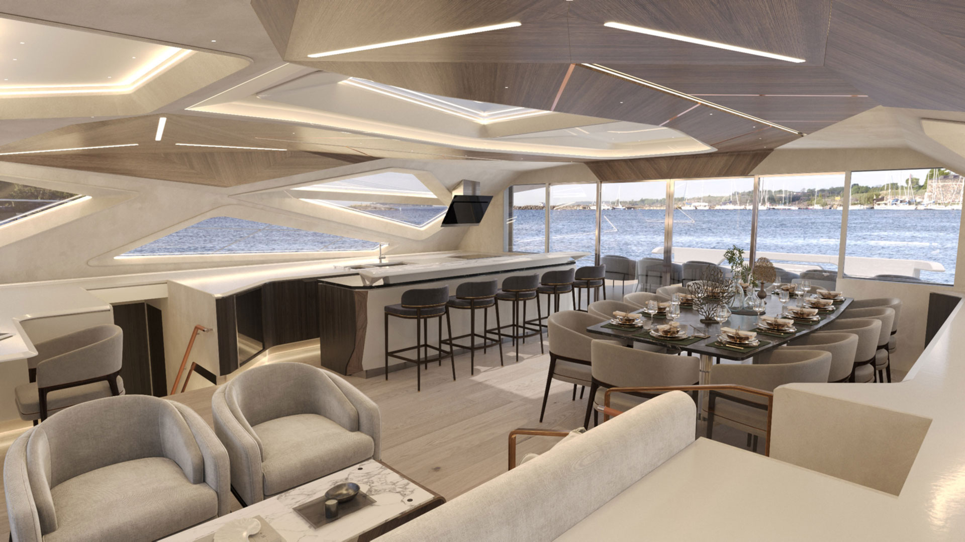 The main salon of LANIAKEA is a floating living space designed for luxury, ease, and modern elegance. Framed by panoramic windows and skylights, it is filled with natural light and uninterrupted sea views. A contemporary dining area, island-style galley, and open lounge merge into one seamless environment that enhances the sense of space, comfort, and connection to the ocean.